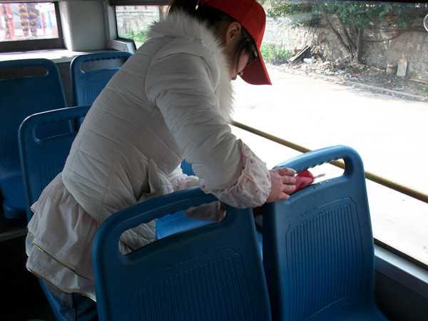 在淮南中北巴士团委负责人的安排和带领下,志愿者们分工协作,清洗公交车车窗、捡车内垃圾和清洗车座上污渍。志愿者们认真负责地做着自己的工作,细心的志愿者同学还将纸屑、烟头等垃圾从角落的缝隙中拣出来,装进随手携带的塑料袋内。