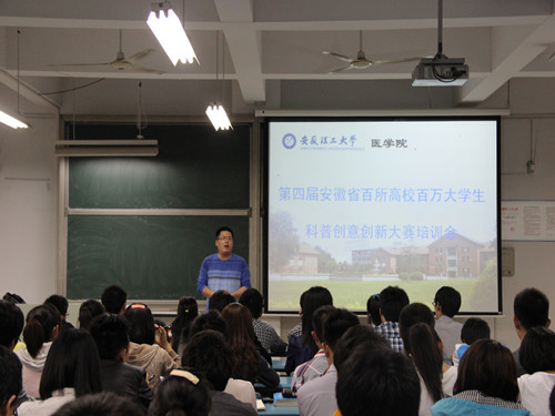 5月27日晚,医学院在西区医教101召开第四届省百所高校百万大学生科普创意创新大赛培训会。学院团委书记赵军与同学们进行现场交流。