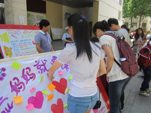 随着年龄的增长,很多同学越来越羞涩于对至亲的人——母亲,说出心中的爱。院团委学生会从此点出发,5月12日上午,精心准备和策划,制作了“妈妈我想对您说”的主题展板,让同学们以便利贴的形式在母亲节这天尽情的表达对母亲的感恩与爱。活动现场还录制了《大声说出你想对妈妈说的话》视频。此外,学生会成员还打出宣传标语“亲,你今天给妈妈打电话了吗?”,鼓励同学们利用节日给自己的母亲打电话,表达对母亲的感恩之情。