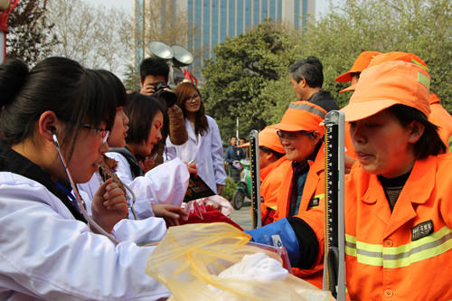 活动当天,志愿者利用所学的专业知识为淮南市田家庵区的环卫工人进行免费血压、视力等检查。活动现场还设立咨询台,志愿者们详实的为环卫工人讲解她们提出的问题,并对环卫工人的职业病防护给予参考意见。最后,志愿者还将准备的60个卫生口罩送给了现场的环卫工人。