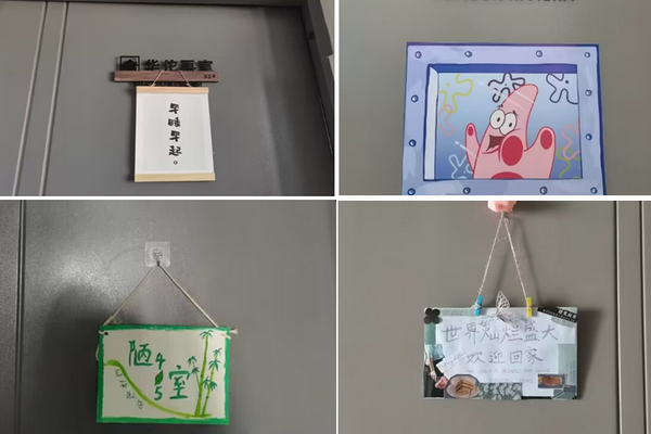 “斯是陋室,惟吾德馨”。女生寝室中,首先映入眼帘的便是新颖独特的寝室名称,如信苑C3A213的“觉醒青年”、C3D529的“华佗再室”等,它们既是寝室的象征,也是宿舍成员性格的体现。精美别致的手工门牌,展示着女生灵巧的动手能力。
