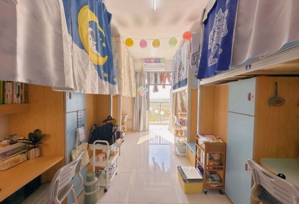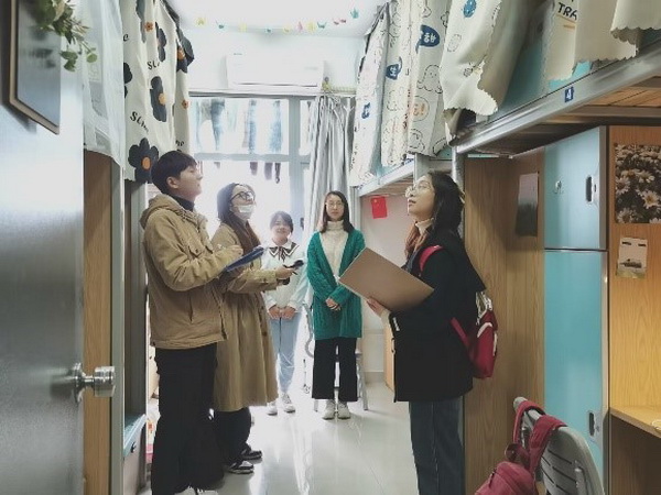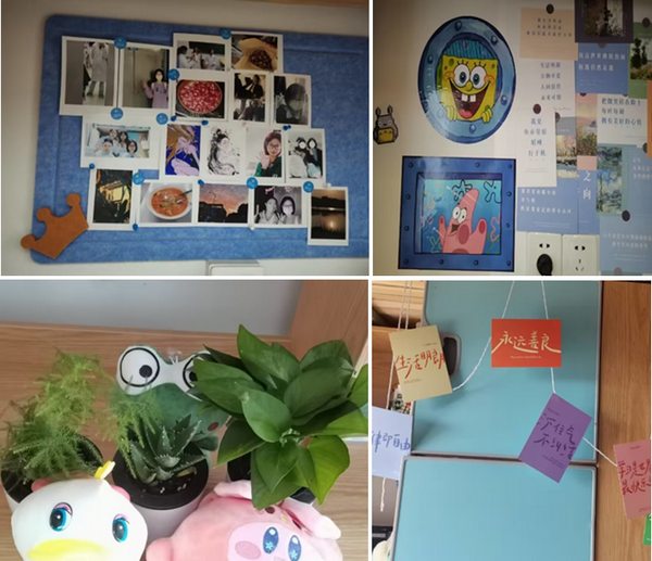 踏入宿舍,看到的是整齐的被子、干净的地板以及温馨的装饰。参赛者们依次向评委们阐述了各自宿舍的装扮构思和创意亮点。各个宿舍的风格不一,信苑C3E313室以“比奇堡”为主题,寝室里用充满氛围感满满的云彩灯进行装饰,柜子上都贴满了海绵宝宝系列的卡通人物,用来代表她们不同的性格和特点。信苑D327宿舍将室友们从入学相识到相知的生活瞬间的照片打印下来贴在墙壁上,表现出她们喜爱照片记录生活的态度,把平凡的生活变得弥足珍贵。除了温馨舒适的生活环境,各寝室还制定了包含秩序管理、作息时间、卫生值日和注意事项的宿舍公约,为积极健康的生活状态提供保障。