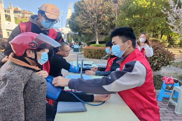 志愿者们在医学院老师的培训和知识指导下,熟练的掌握水银血压仪的使用及血压相关知识。活动期间,志愿者们为山南社区中老年人测量血压,并详细询问他们的生活习惯及身体状况。根据测量结果及身体状况,指导建议他们健康饮食和适量锻炼。与此同时,针对近期甲型流感的来袭,志愿者们也贴心地告知他们甲流相关症状以及如何预防和应对甲流。志愿者们熟练地操作和耐心地答疑获得了社区居民的肯定与赞许。