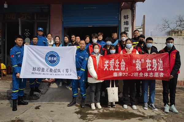 3月18日上午,临床医学22-2班志愿者们来到蚌埠市蓝天救援队本部进行以“关爱生命,‘救’在身边”为主题的活动。志愿者们了解到蓝天救援队是一个社会公益组织,队员们来自社会各个阶层,但在灾难面前都愿意竭尽所能挽救生命。首先蓝天救援队医疗部宣讲师刘霞向志愿者们传授了有关心肺复苏和海姆利克急救法的理论知识,如心肺复苏的黄金救援时间、具体救援流程、救援的细节(按压频率、按压深度、按压次数、按压比例等)以及海姆利克的发力要点、发力方式。理论知识学习结束后,志愿者们在蓝天救援队队员的带领下进行了实际操作,将刚刚学习到的救援知识运用到实际操作中,深刻体会到了救援操作的艰难。