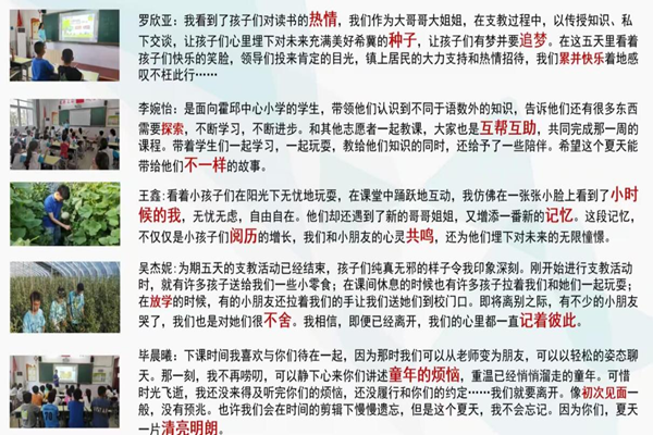 最后,支立婷同学在志愿服务精神宣讲活动中感慨道:“在这五天的支教活动中看着孩子们快乐的笑脸,以及家长们投来的肯定目光,我们累并快乐着地感叹不枉此行。”短短五天的支教活动不仅为给孩子们带来了新奇的知识和体验,同时也给支立婷和其他志愿者带来了巨大的收获,让他们感受到了志愿服务的意义所在。