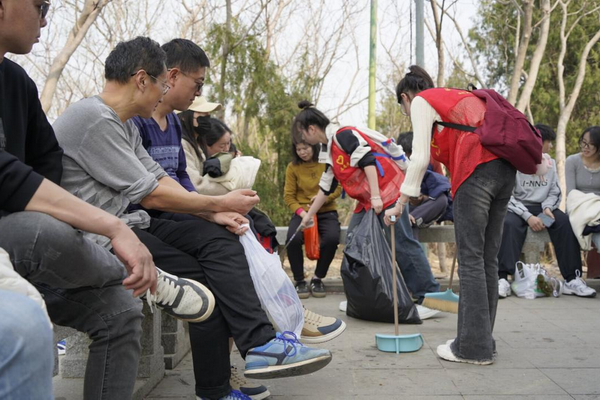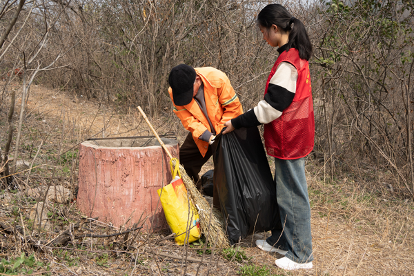 志愿者与保洁大叔一起处理舜耕山的垃圾桶