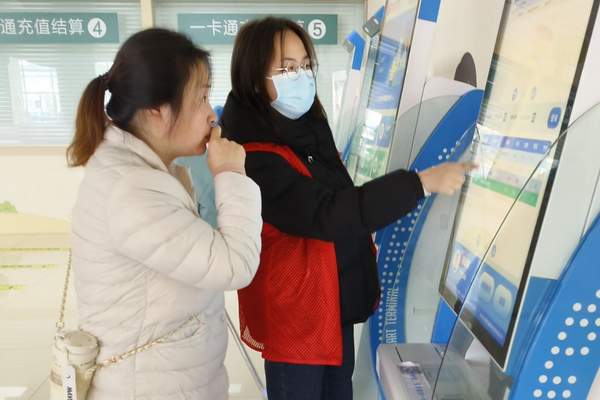 志愿者在帮助群众使用自助机