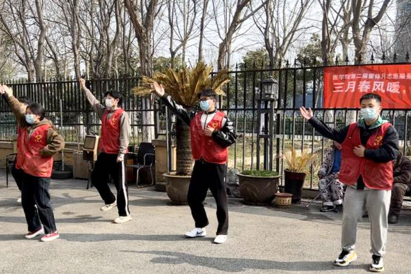 为鼓励老年人积极锻炼身体,增强体魄,志愿者们与老人们共同学习“手指操八段锦”。最后,志愿者们以一曲欢快的舞蹈表演——《相亲相爱》,为本次志愿服务活动画上了圆满的句号。