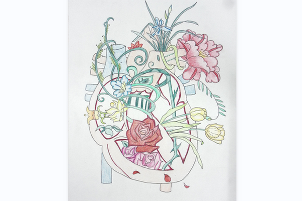 临床23-8班傅佳明的作品《春之归》以“心脏”为创作载体,运用春天盛开的形色各异的花朵对其进行修饰,生动形象地展现出内心无论受到什么挫折,最终都将像春天里生机盎然的花朵,不断生根发芽,长出新的枝条,最终开出美丽的花朵。