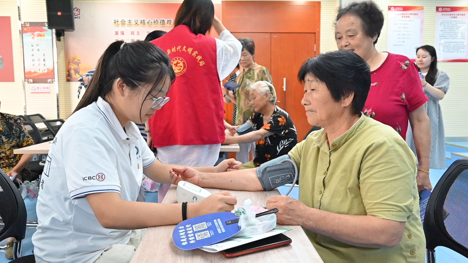 志愿者们走进社区,现场为村民测量血压、血糖,并根据测量结果为血压偏高或偏低的居民提出了指导建议。“定期测血压,感觉不舒服时要及时测量血压。”“遵医嘱坚持长期药物治疗,不要自行停药或调整药物”......现场氛围热烈,志愿者们通过发放健康教育处方的方式普及健康知识,同时还为每一位村民送上包含碘伏、风油精、创可贴、口罩的爱心医药包。