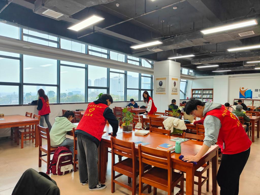 仪式结束后,安徽理工大学医学院的志愿者们对图书进行整理归纳,将散乱在阅览区的各类图书按照分类逐一归位,确保每一本书都能找到自己的“家”。指尖划过书脊,带走的是浮尘,留下的是对知识与文化的敬畏。阅览区内,志愿者们手持抹布和清洁剂,细致擦拭每一张桌椅,每一列书架,让木质的纹理焕发温暖的光泽,为读者营造一个干净、舒适的阅读环境。