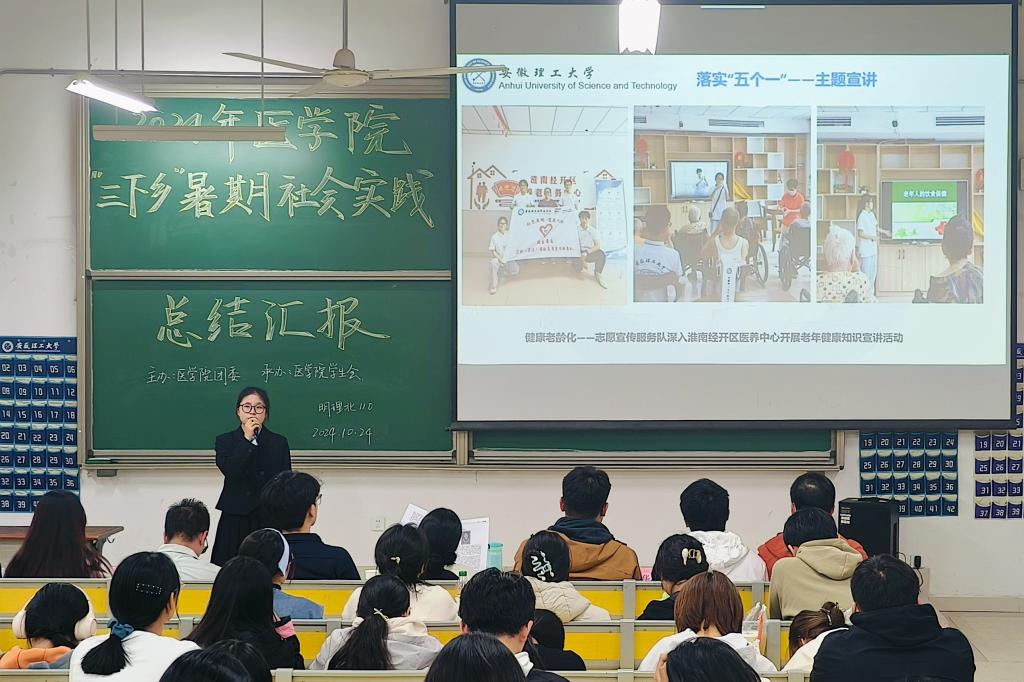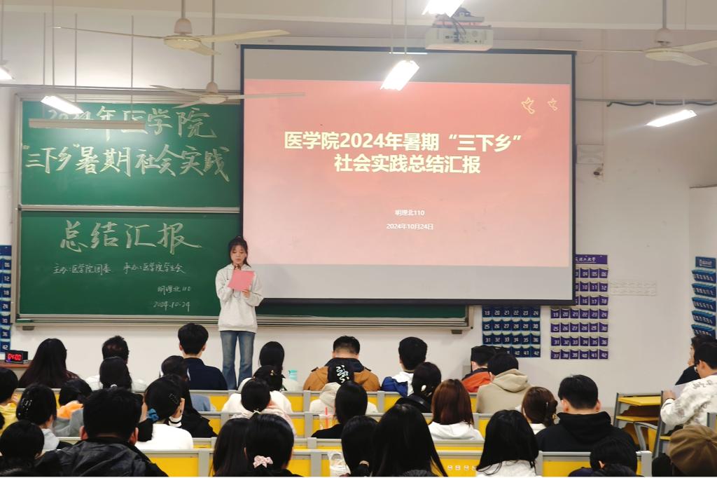 为深入总结暑期社会实践活动的经验与成果,积极传递我院青年学子服务基层发展与助力乡村振兴中展现的青春力量。10月24日晚,医学院团委在明理北110教室召开暑期社会实践汇报会。医学院辅导员及学生代表担任活动评委,约120余名学生现场参会。