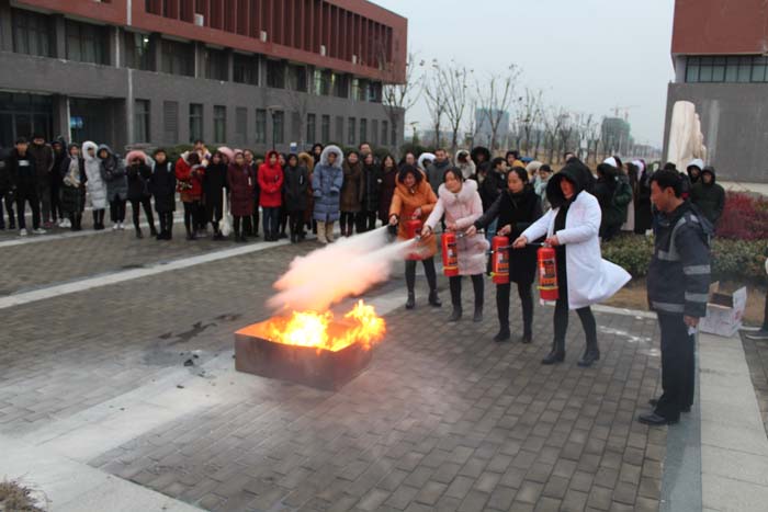 讲座结束后,在彭广峰和陈伟两位老师的指导下,老师、同学到室外开展了灭火器使用的现场实际操作。
