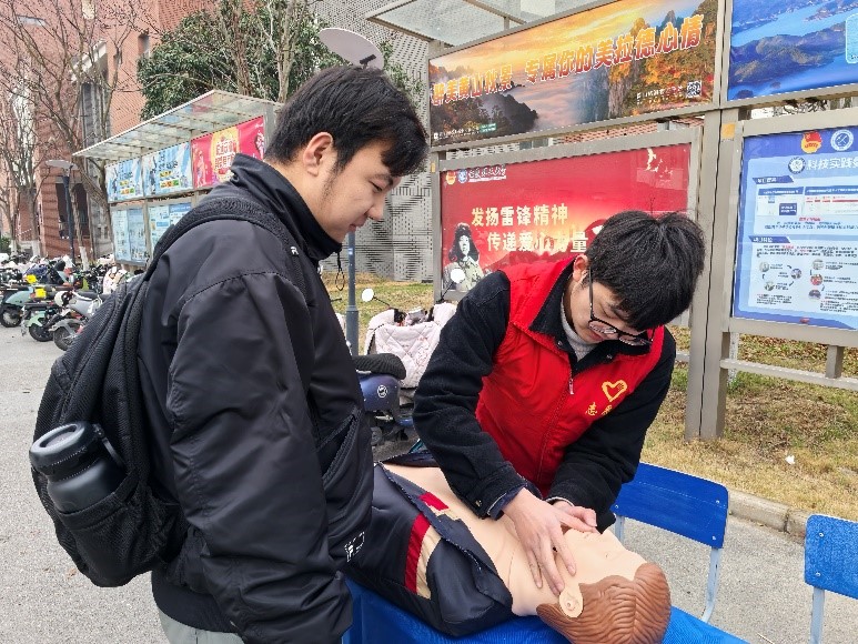 中午时分,志愿者们又来到仁苑食堂开展普及急救知识宣传活动,利用人体模型为过往的同学演示如何进行心肺复苏术,讲解进行心肺复苏术的动作要点。在急救知识问答环节,吸引了众多同学积极参与,现场气氛热烈。