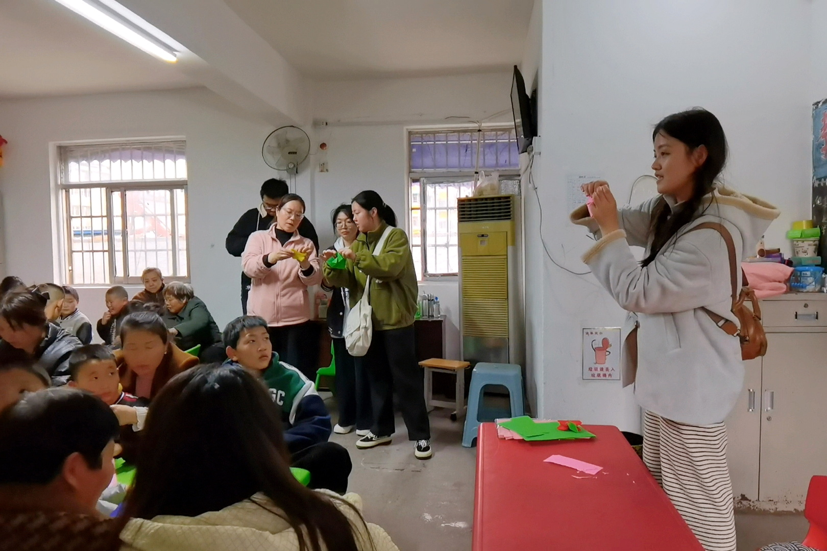 志愿者指导小朋友们折纸飞机