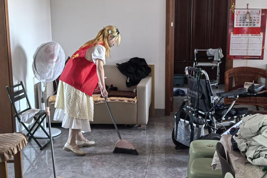 志愿者为抗美援朝老兵打扫卫生