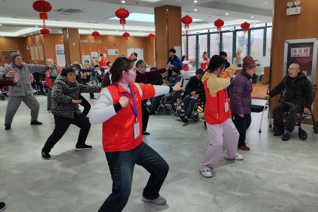 志愿者在老年公寓带领老人练习八段锦
