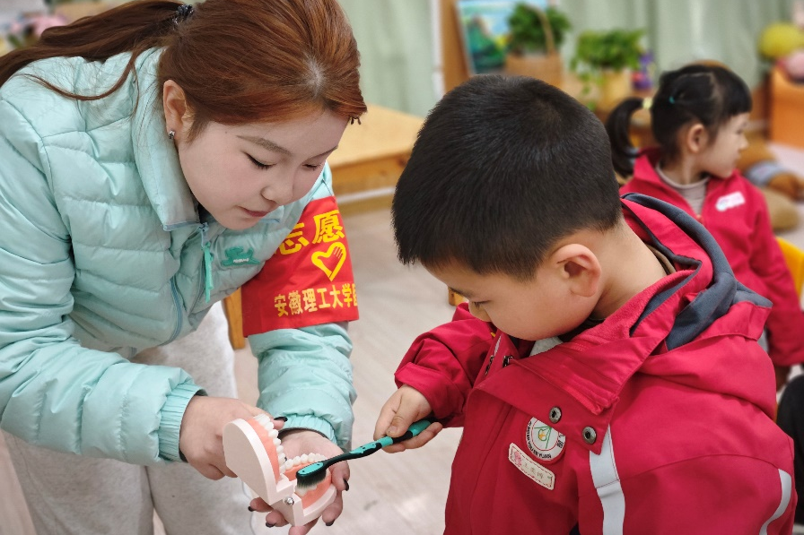 志愿者教幼儿园小朋友正确的刷牙方式