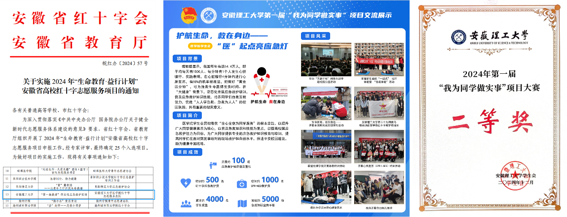 项目开展的活动及取得的成效在安徽青年报、安徽学联、安青网、安徽理工大学新闻网、安徽理工大学医学院官网等多家媒体报道。项目经过长期积累,获得安徽理工大学“我为同学做实事”大赛二等奖,成功入选2024年“生命教育·益行计划”安徽省高校红十字志愿服务项目,并获得资金支持。