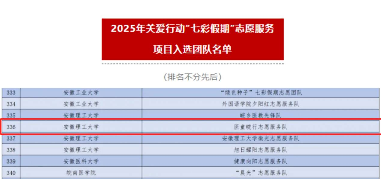 为深入学习宣传贯彻习近平新时代中国特色社会主义思想,切实加强对少年儿童群体的关心关爱,组织动员青年志愿者以实际行动投身中国式现代化建设,团中央青年志愿者行动指导中心、中国青年志愿者协会秘书处发布了《关于遴选2025年关爱行动“七彩假期”志愿服务团的公告》。活动得到了各高校青年志愿服务团队的广泛关注和积极参与,医学院“医童皖行志愿服务队”从全国8022支青年志愿服务团队中脱颖而出,成功入选。