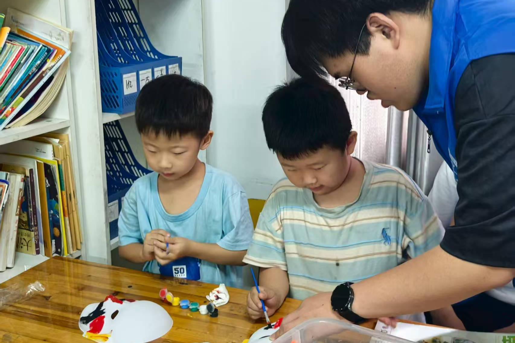 团队分别在青少年活动中心与至诚教育托管中心开展“国粹脸谱绘”文化活动。志愿者通过多媒体课件,生动讲解京剧脸谱的历史与颜色象征,引导30余名孩子亲手绘制脸谱。现场欢声不断,更有孩子即兴表演京剧选段。