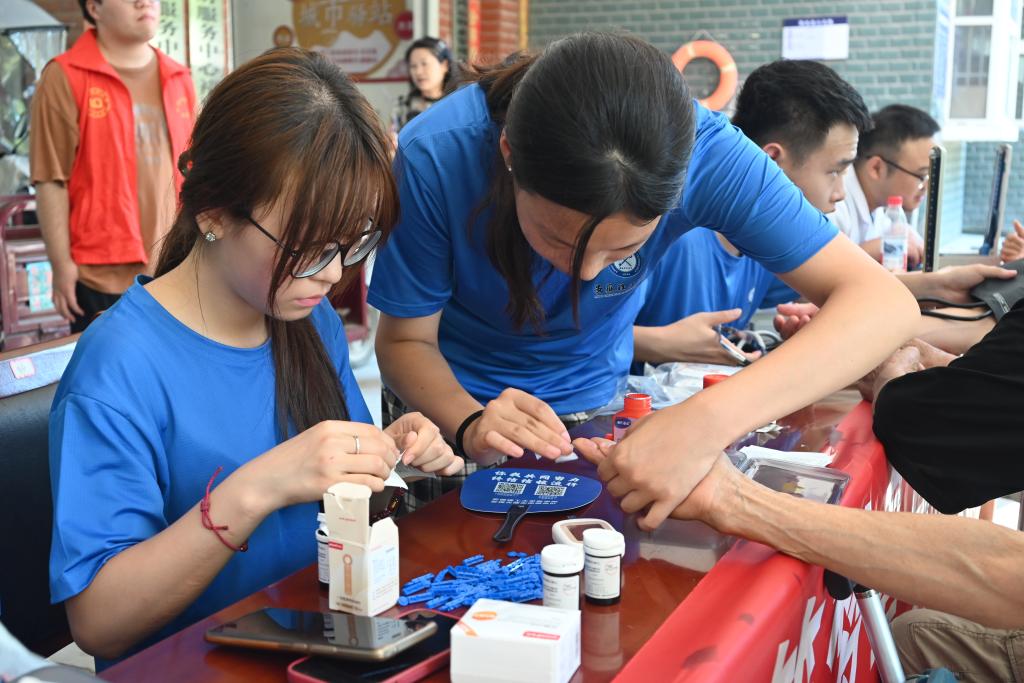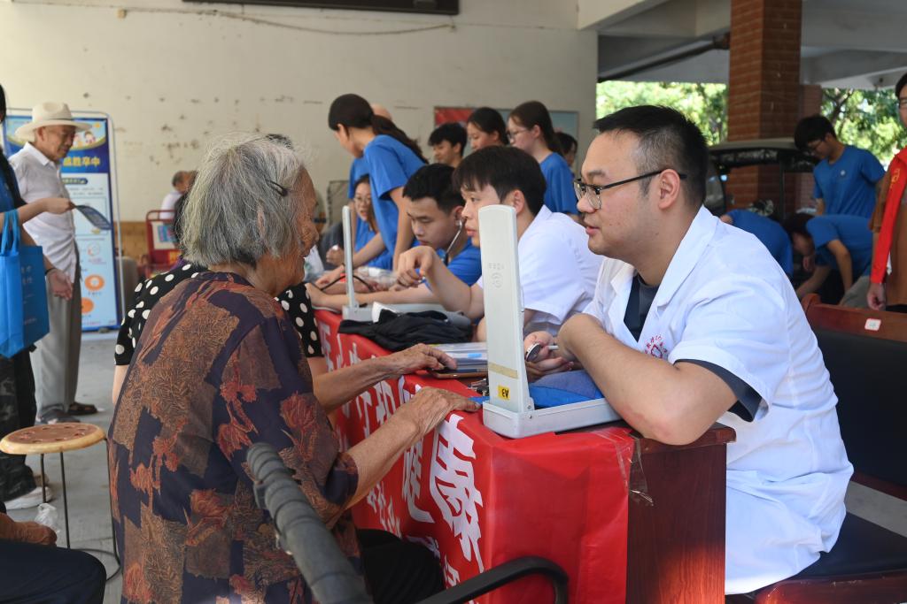 由医学院15名师生组成的“临床专家+大学生”健康关爱团队,在裕泉花园小区设置临时诊疗点,为社区居民提供健康咨询及身体检查,医生耐心地为居民问诊,解答问题并提供个性化健康指导。志愿者们为居民们进行血压和血糖测量,一边测量,一边向居民解释指标的意义和日常注意事项。