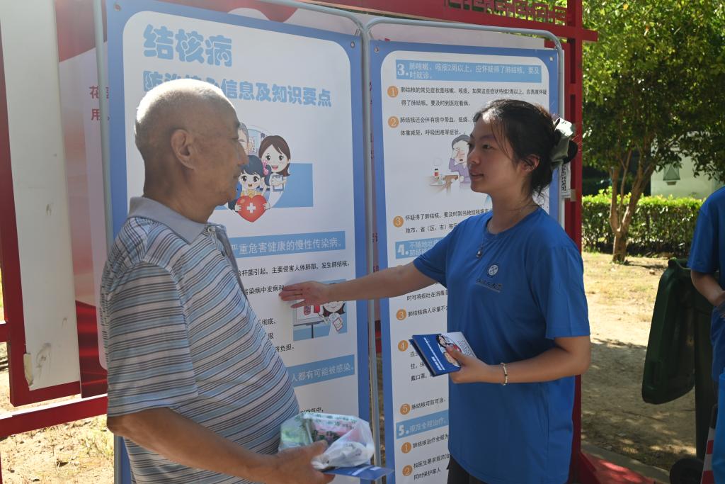 志愿者们利用展板和宣传手册,向居民详细讲解了“中风120”识别法。通过生动的案例和现场演示,让居民们快速掌握了脑卒中相关知识。在肺结核防治宣讲中,队员们从传播途径、症状、预防措施等方面进行了全面介绍,提升了大家的防病意识。同时志愿者还结合模拟道具,教学海姆立克急救法,让居民在互动中掌握应急处理要点。