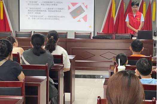 志愿者们前往社区开展以“小小淮矿情报员——红色探险之旅”为主题的爱国教育活动。在这里,队员向孩子们介绍了淮南煤矿工人抗日大罢工的历史背景、英雄人物及斗争事迹,并播放抗战纪录片,让孩子们真切地体会到战争的残酷以及和平的来之不易。