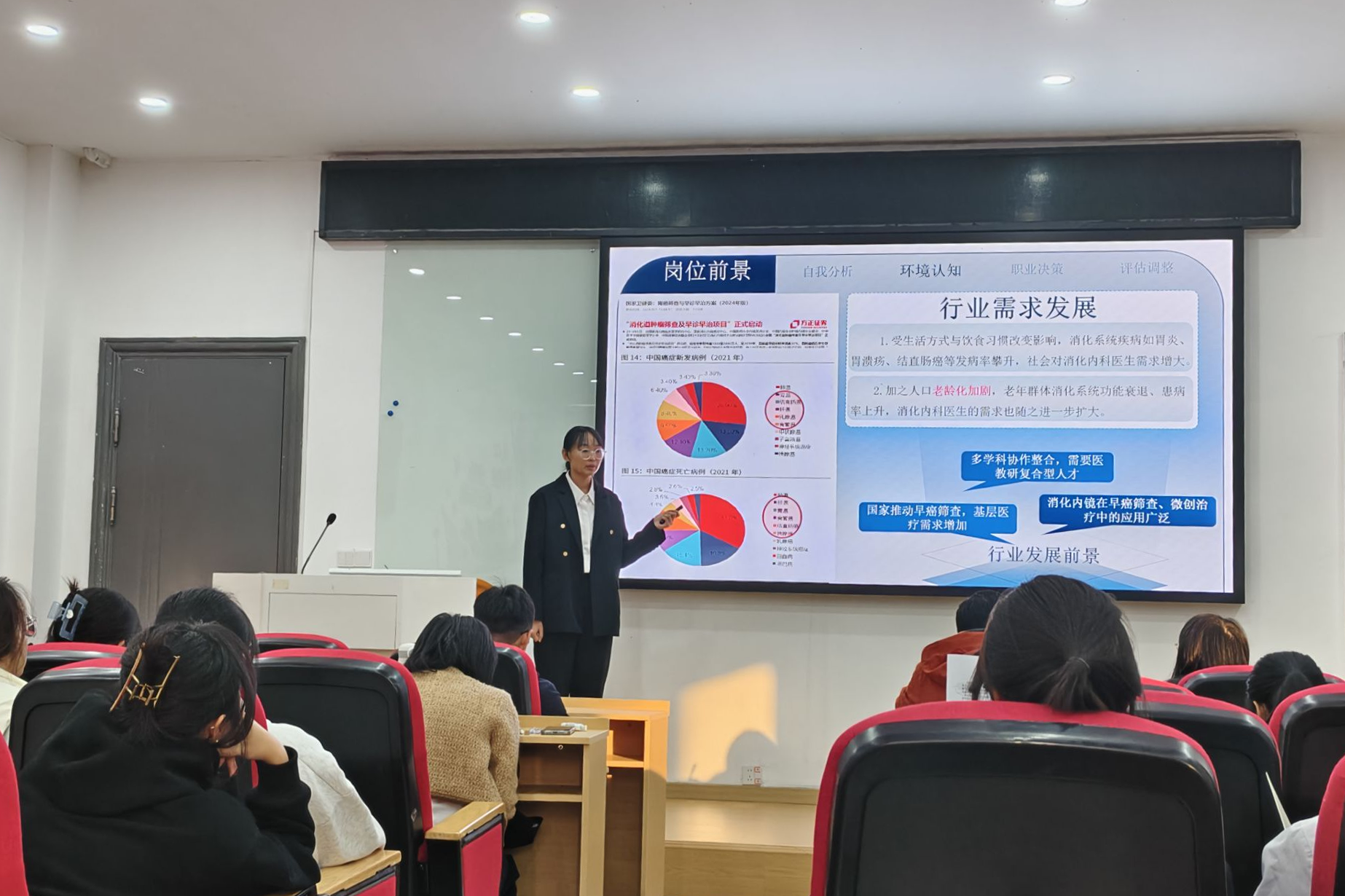 本次院级赛共有18名同学晋级现场展示环节。参赛选手们立足专业特色、优势能力,结合市场需求,勾勒出多元清晰的职业规划:他们有的怀揣医学初心,希望返乡担任社区医生,造福家乡;有的秉持专业热忱,希望成为兼具理论与实操的优秀外科医生,解决疑难杂症;有的深耕医学内容传播,立志成为精准洞察需求的自媒体运营,传递优质多元信息。