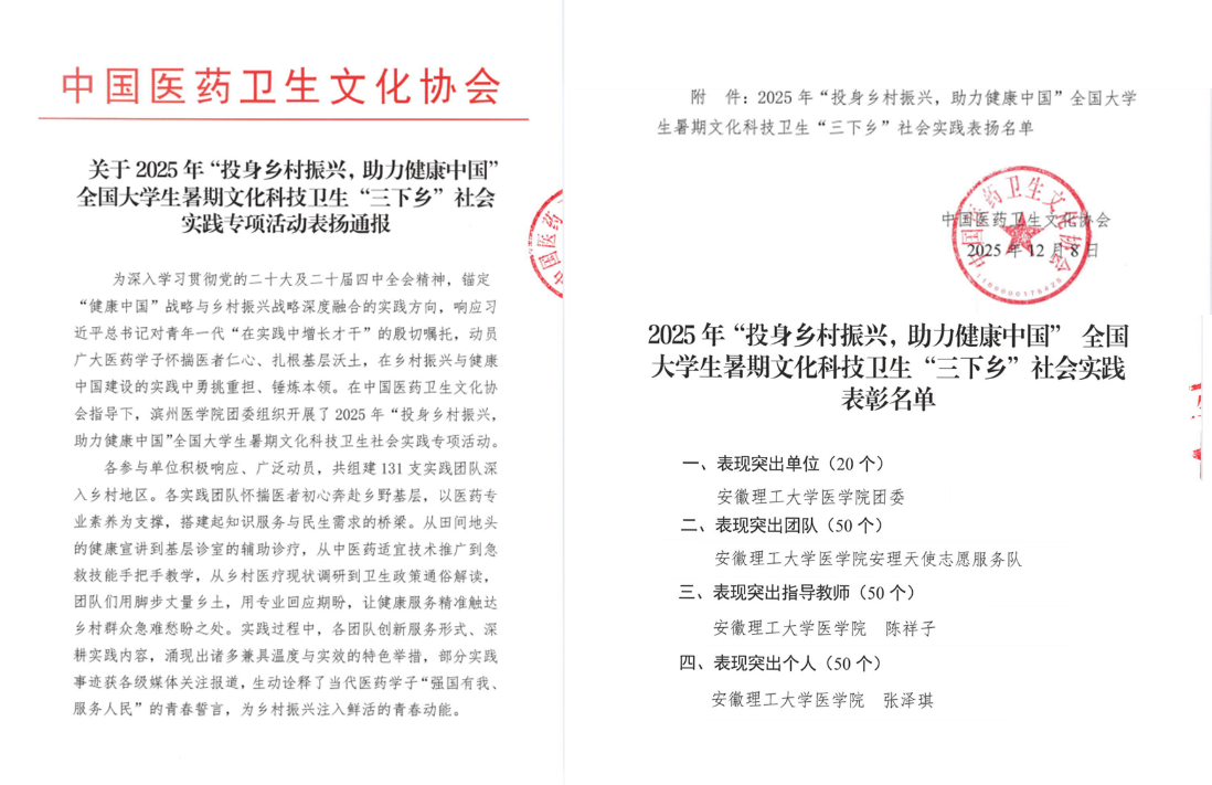 近日,中国医药卫生文化协会发布《关于2025年“投身乡村振兴,助力健康中国”全国大学生暑期文化科技卫生“三下乡”社会实践专项活动的表扬通报》,我校医学院团委凭借在该项活动中的卓越表现,荣获“表现突出单位”称号;医学院安理天使志愿服务队荣获“表现突出团队”;教师陈祥子获评“表现突出指导教师”;学生张泽琪获评“表现突出个人”。