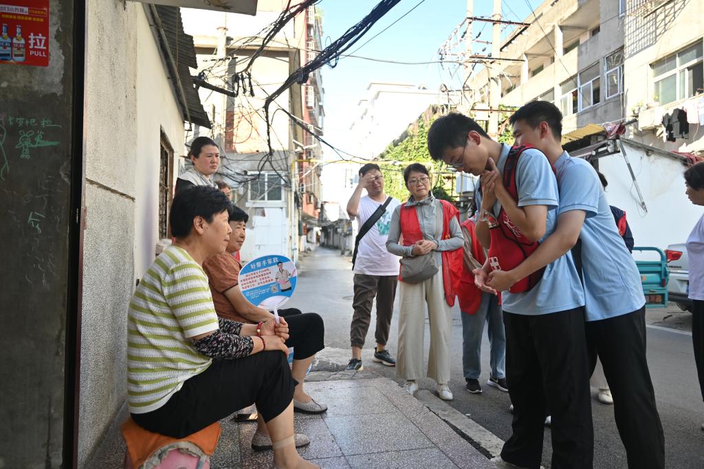 志愿者在淮南市舜耕社区为居民讲解海姆立克急救法