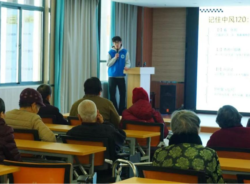 志愿者在老年公寓开展健康科普课堂,依托专业知识聚焦中风防治,通过PPT演示、通俗讲解拆解医学知识点,耐心解答老人疑问,指导老人掌握居家自我保健技能,切实提升老年群体健康素养,为银发群体筑牢健康屏障。