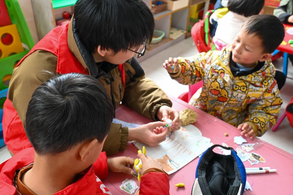 讲解后志愿者们化身“孩子王”带领小朋友们开展粘土手工创作,引导大家捏出想象中病毒的形状,在动手实践中传递科学认知。
