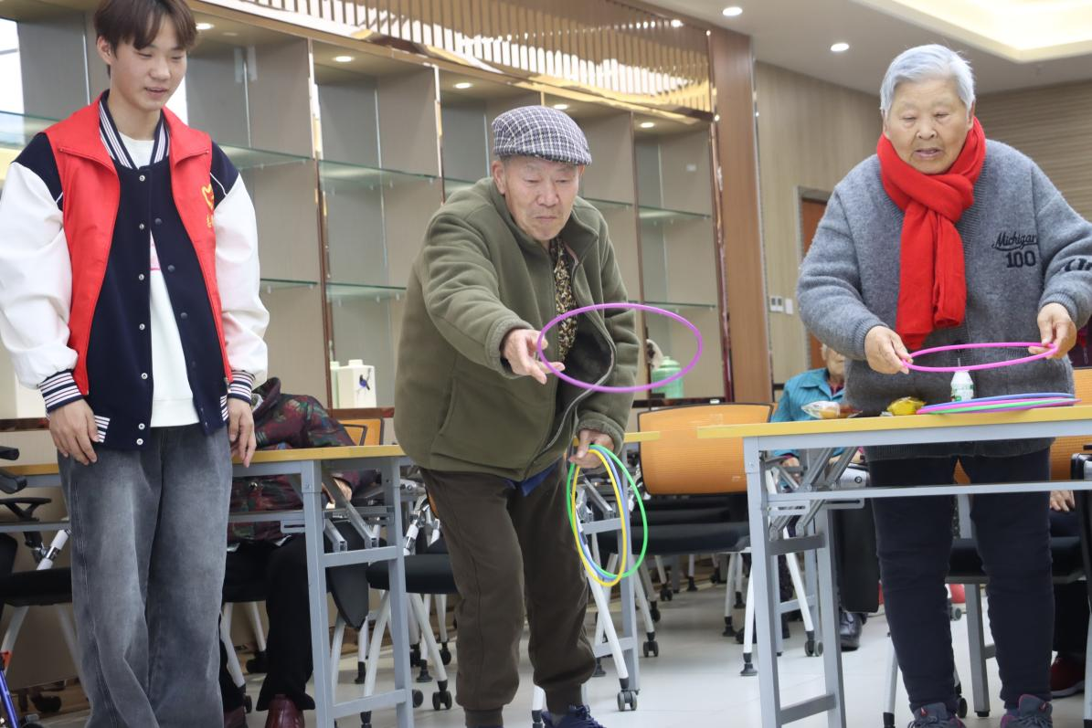 志愿者与老人共同参与套圈等趣味游戏,活动中耐心引导、贴心陪伴,在轻松互动中拉近彼此距离,丰富老人精神文化生活,以温情陪伴驱散孤寂,传递青春暖意。