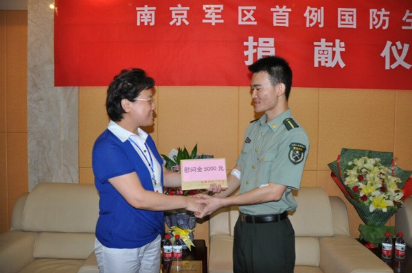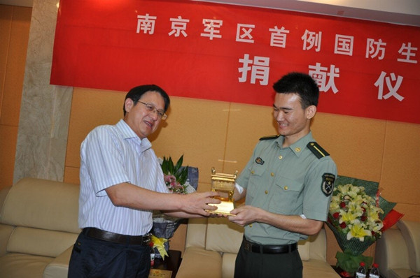 7月9日下午,我校国防生黄海松同学造血干细胞捐献仪式在安徽省立医院隆重举行。安徽省军区政治部主任孙进、安徽省委教育工委常务副书记高开华、我校副校长叶醒狮、南京军区政治部干部选培办副主任王一迪、安徽省红十字会秘书长孙齐云和南京军区驻安徽理工大学选培办主任辛崇波等出席捐赠仪式并亲切慰问黄海松同学及其家人。我校学生处处长田中良,医学院党委书记张荣波、副书记张可佳等出席仪式。
