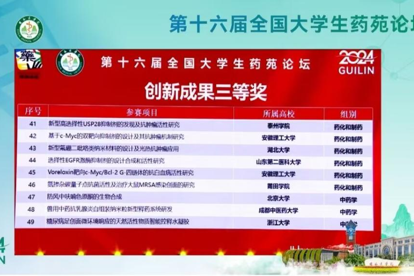 11月23日,由全国药学类院校大学生专业技术与实验技能竞赛组委会主办、桂林医学院承办的第十六届“全国大学生药苑论坛”在桂林市落下帷幕,全国124所高校的近600名师生参与。我校两支参赛团队参加此次竞赛,并获得两项“创新成果奖三等奖”。