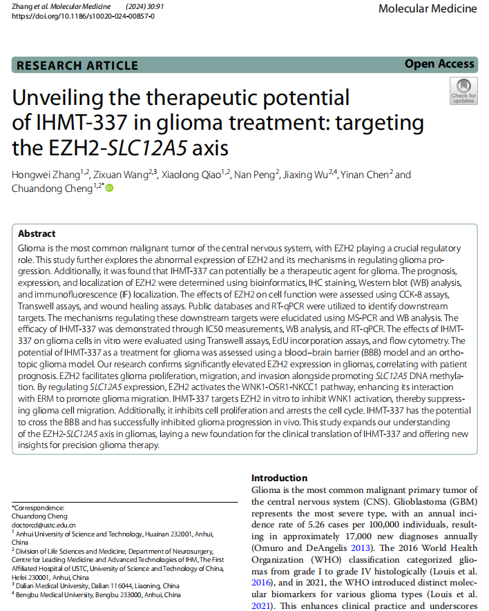 近日,安徽理工大学医学院2022级外科学硕士张宏伟同学以第一作者身份,在国际期刊《Molecular Medicine》(JCR1区、中科院2区 IF:6.0)发表题为《Unveiling the therapeutic potential of IHMT-337 in glioma treatment: targeting the EZH2-SLC12A5axis》的论文。我校医学院2020级外科学硕士乔晓龙为共同作者,医学院导师程传东副教授为通讯作者。