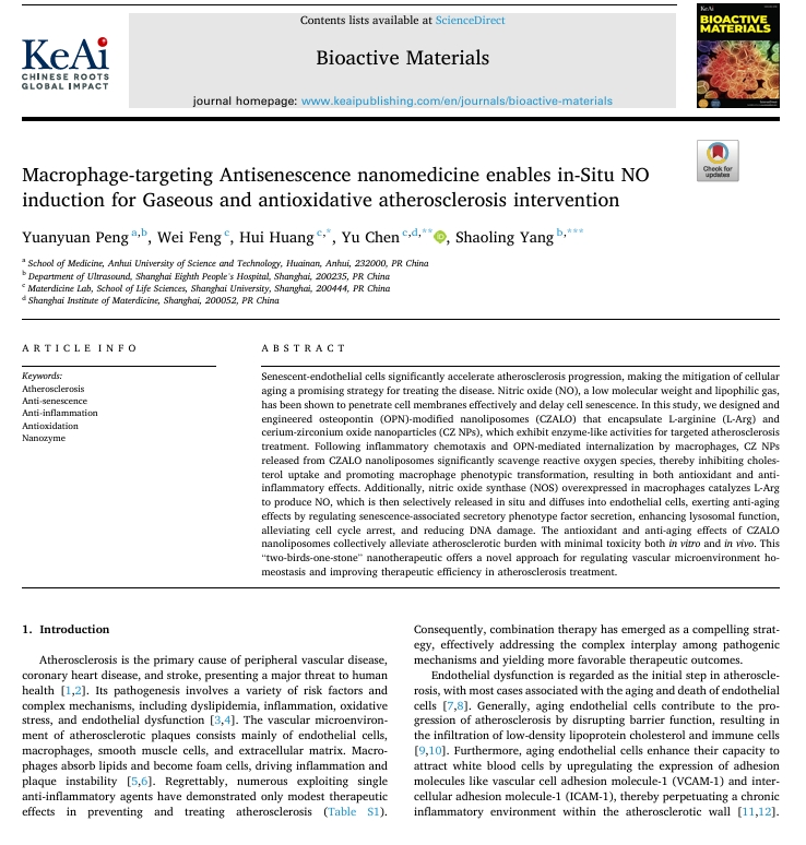 彭媛媛,安徽理工大学医学院2022级影像医学与核医学专业硕士研究生,以安徽理工大学医学院为第一单位、以独立第一作者身份在国际医学期刊《Bioactive Materials》(中科院1区TOP期刊,IF:18.9)发表题为《Macrophage-targeting Antisenescence nanomedicine enables in-Situ NO induction for Gaseous and antioxidative atherosclerosis intervention》的论文。安徽理工大学奉贤临床医学院研究生导师杨少玲教授为通讯作者。
