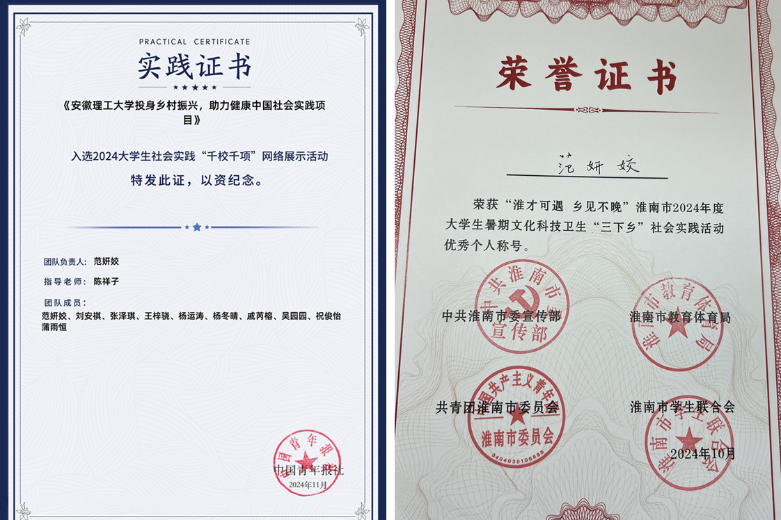 曾获得校优秀共青团员、三好学生、优秀学生奖学金、淮南市2024年度大学生暑期文化科技卫生“三下乡”社会实践活动优秀个人、第九届全国大学生命科学竞赛(创新创业类)一等奖、全国大学生创新研究暨实验设计论坛三等奖、第十五届安徽省百所高校百万大学生科普创意创新大赛校一等奖、安徽省大学生基础医学实验技能竞赛二等奖、团队入选2024年大学生社会实践“千校千项”网络展示活动。