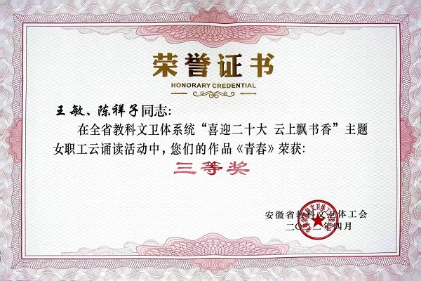 近日,安徽省教科文卫体工会公布了“喜迎党的二十大 云上飘书香”主题女职工云诵读活动获奖名单,医学院王敏、陈祥子两位辅导员老师诵读的作品《青春》荣获三等奖的好成绩(我校唯一获奖作品),同时,我校工会荣获优秀组织奖。