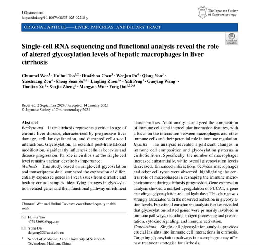 2023级研究生文春梅为第一作者在国际权威期刊《Journal of Gastroenterology》(中科院医学一区TOP)在线发表题为《Single-cell RNA sequencing and functional analysis reveal the role of altered glycosylation levels of hepatic macrophages in liver cirrhosis》的学术论文。论文以安徽理工大学医学院为第一单位,戴勇和陶慧慧为共同通讯作者。该项目是2024年安徽省临床医学研究转化专项“基于多维度时空组学的肝癌诊断标志物和治疗靶点发现及临床诊疗研究”成果一部分。