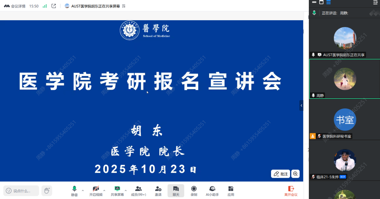 为帮助2026届本科生准确把握考研形势,科学确立考研目标学校,展示学院培养研究生实力和成果,10月23日下午,医学院组织召开线上2026届本科生考研报名宣讲会。学院院长胡东主讲,学院党委副书记周静主持会议,学院副院长葛德永、毕业班辅导员、2026届考研本科生参加会议。