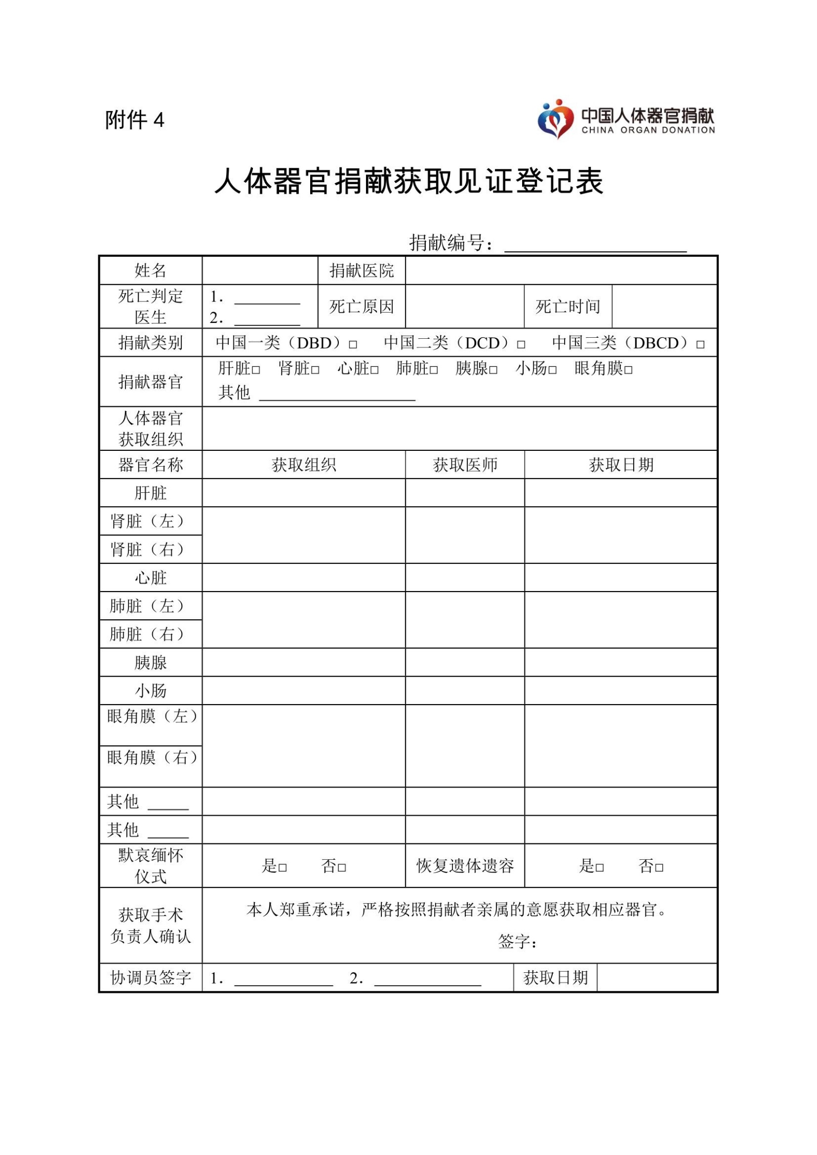 第十九条 协调员现场见证捐献器官获取过程及获取手术负责人在《人体器官捐献获取见证登记表》(附件4)上签字,协调员审核相关信息准确无误后签字确认。