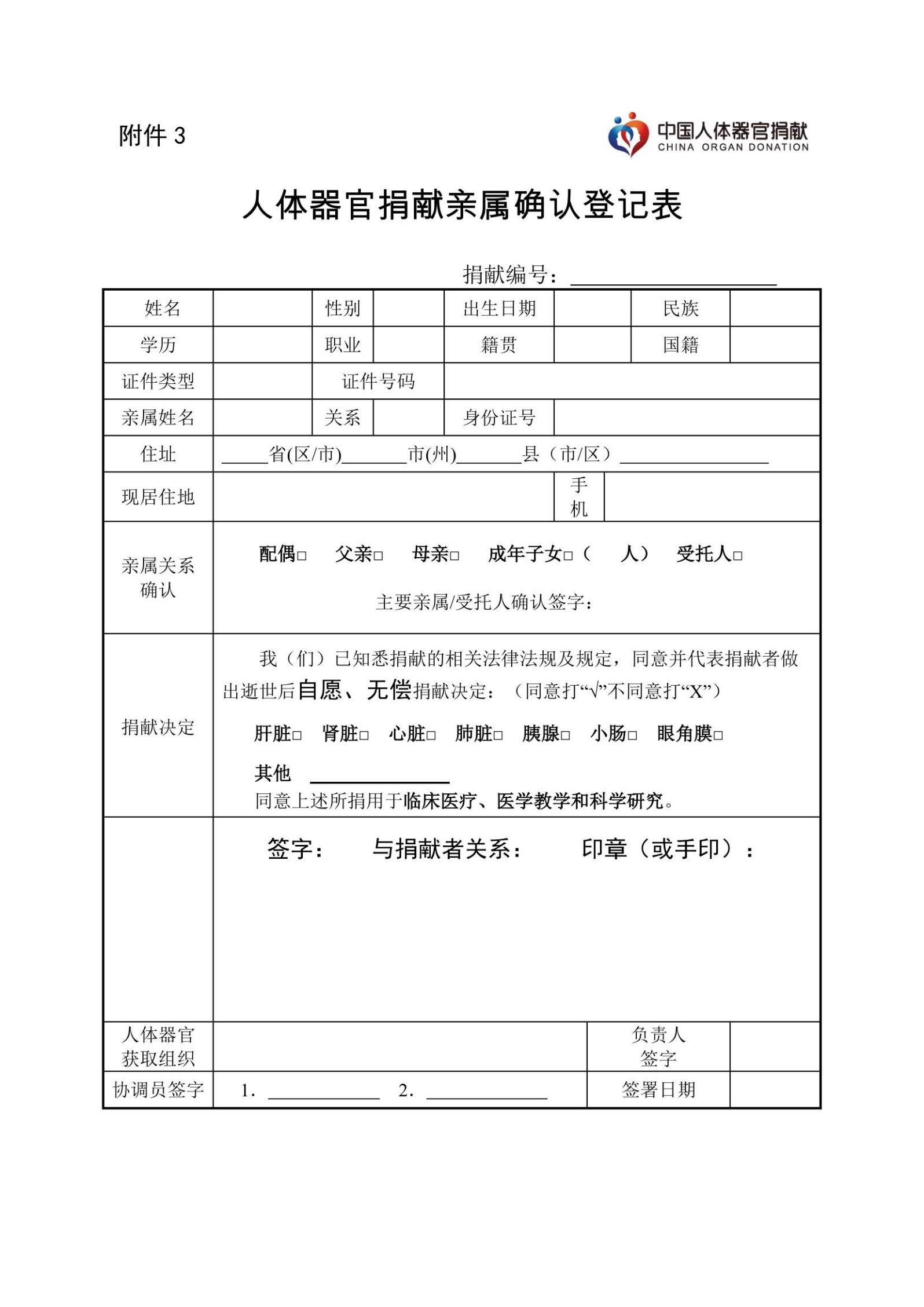 第十八条 协调员现场见证捐献者亲属和人体器官获取组织负责人在《人体器官捐献亲属确认登记表》(附件3)上签字,协调员审核相关信息准确无误后签字确认。