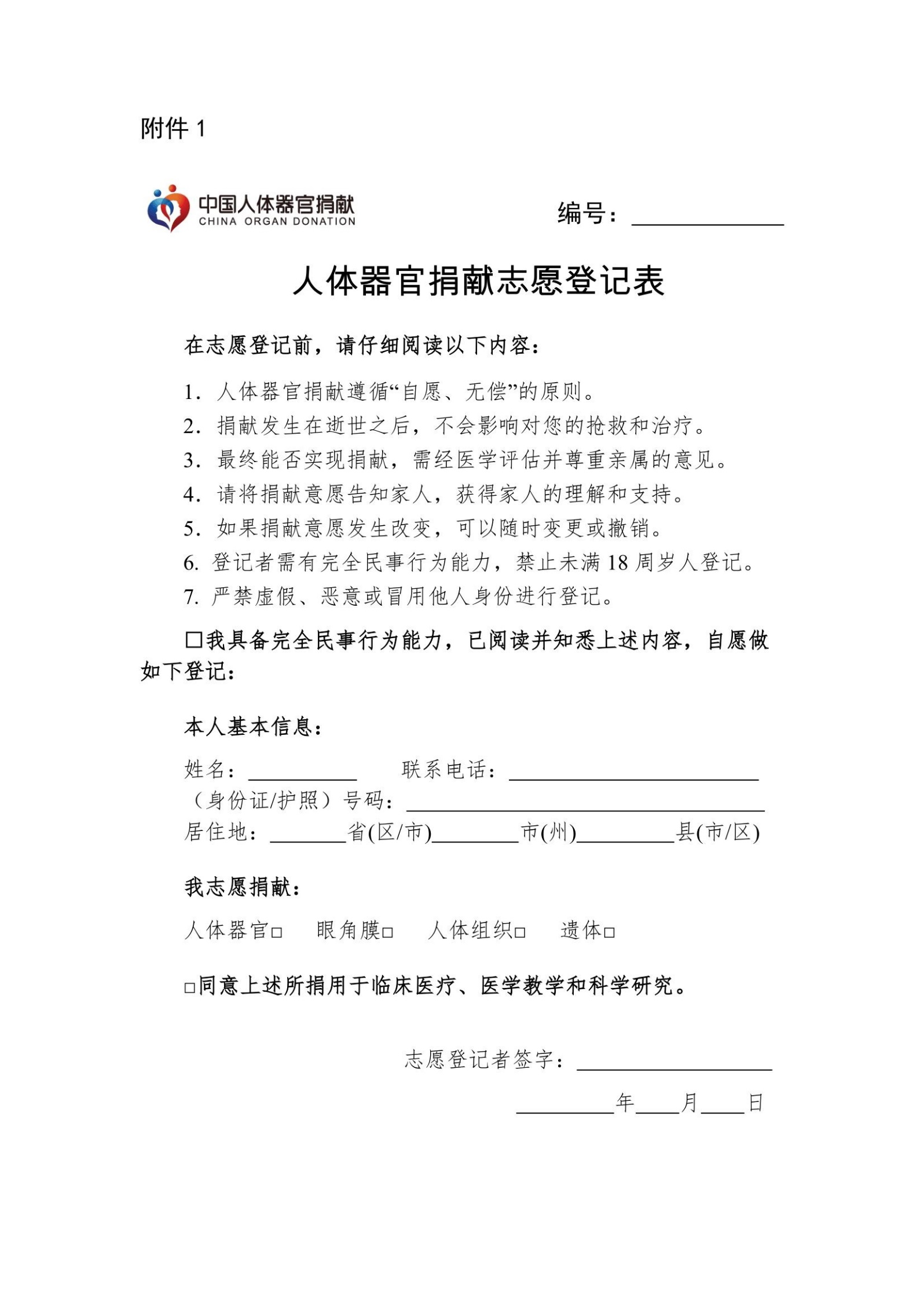 第七条 自愿决定无偿捐献人体器官的完全民事行为能力人可以填写《人体器官捐献志愿登记表》(附件1)进行志愿登记。