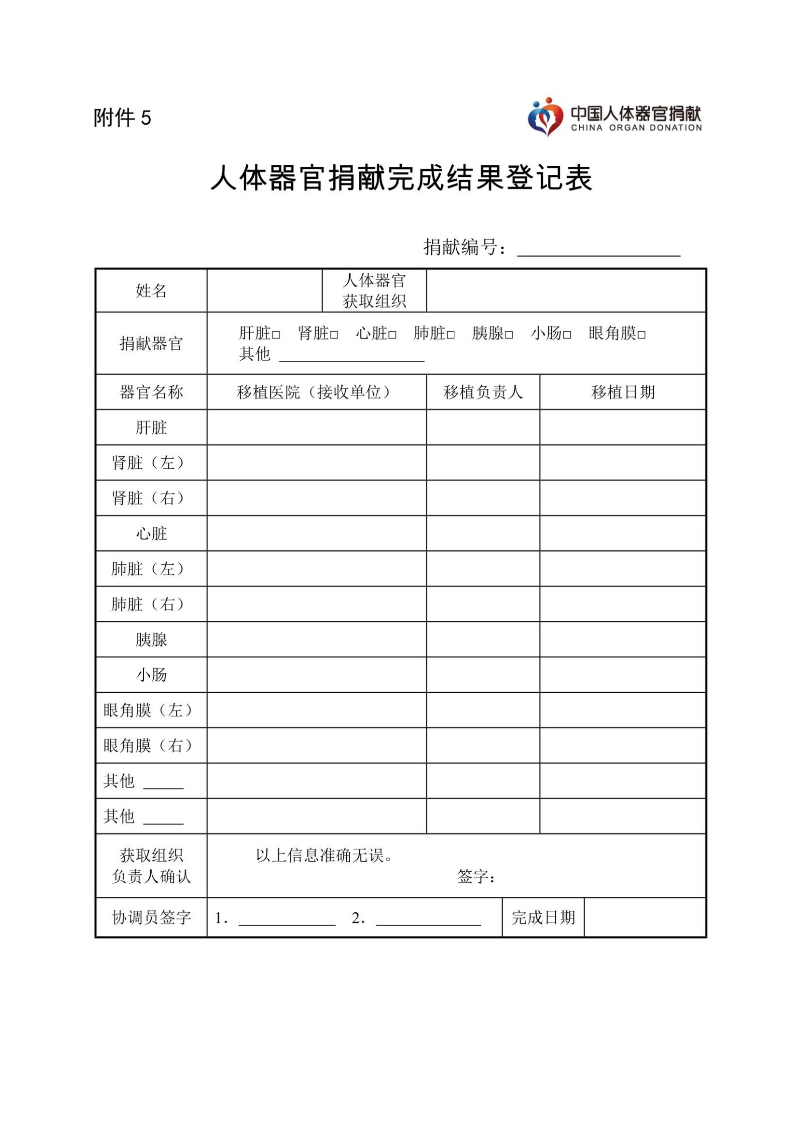 第二十条 获取完成后,人体器官获取组织填写《人体器官捐献完成结果登记表》(附件5)器官分配去向信息,人体器官获取组织负责人签字,协调员审核相关信息准确无误后签字确认。