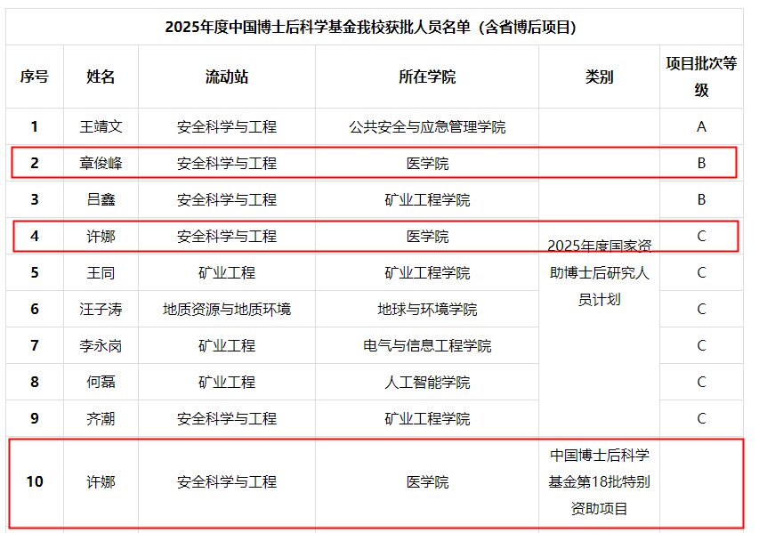 近日,中国博士后科学基金会及国家相关部门陆续公布了2025年度各类博士后科研项目资助名单,我校医学院青年教师章俊峰、许娜分别获批2025年度国家资助博士后研究人员计划B档和C档,其中许娜作为省级博士后工作站在站博士后还获批中国博士后科学基金第18批特别资助项目立项资助,这是今年我校唯一、医学院首次获批的中国博士后科学基金特别资助项目,体现了我校医学类全职博士后科研质量和水平整体跃升。