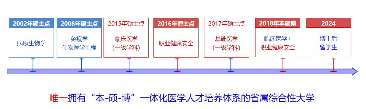 悠悠40载,砥砺前行,已为国家培养5万多名医学人才,毕业生遍布海内外,已发展成为唯一拥有“本-硕-博”一体化医学人才培养体系的省属综合性大学。学院拥有基础医学、临床医学2个一级学科硕士点,与职业健康安全二级学科博士点联合实现贯通式复合型高层次医药人才培养,拥有研究生推荐免试资格。学院坚持开放办学、培养国际视野,拥有海外背景教师十余名,开启博士后、海外博士后及留学生教育。